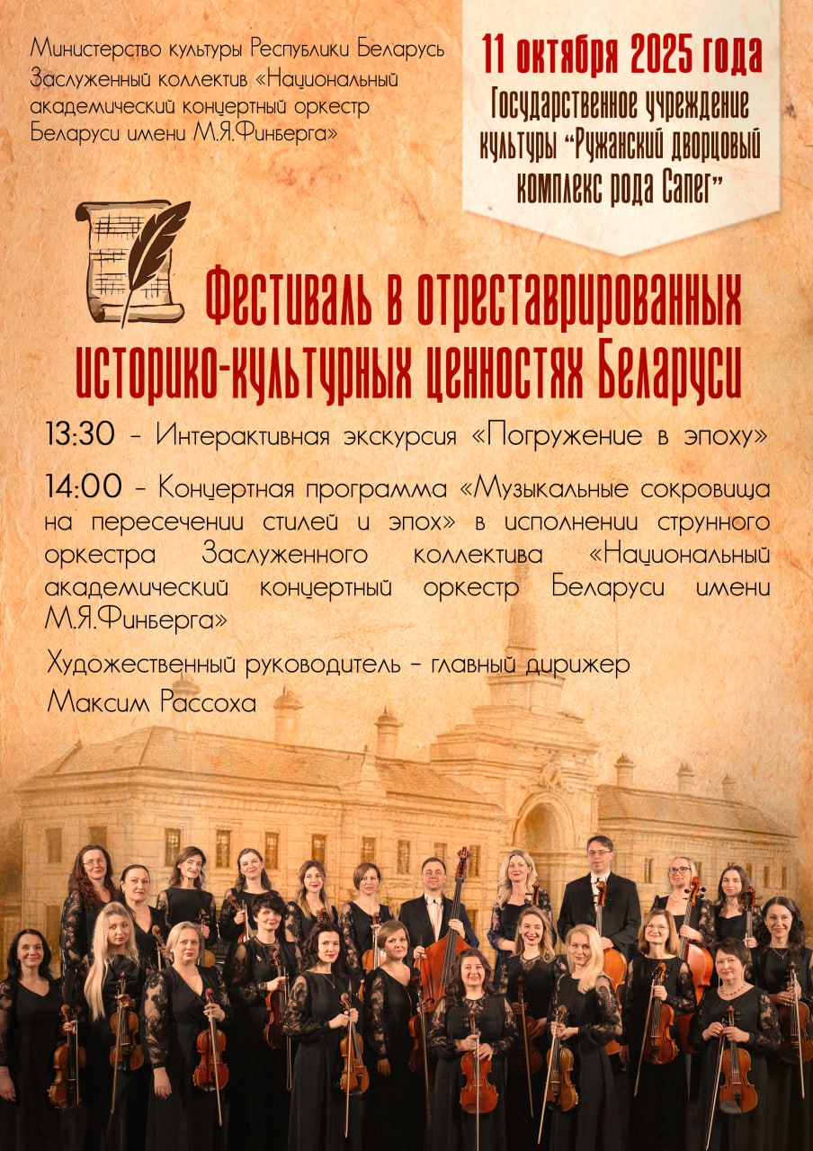 11 октября 2025 года в 14:00 музыка оркестра оживит стены знакового памятника архитектуры Беларуси — Ружанского дворцового комплекса рода Сапег. Струнный оркестр Заслуженного коллектива отправится в музыкальное путешествие, чтобы предложить зрителям полное погружение в историю и культуру.