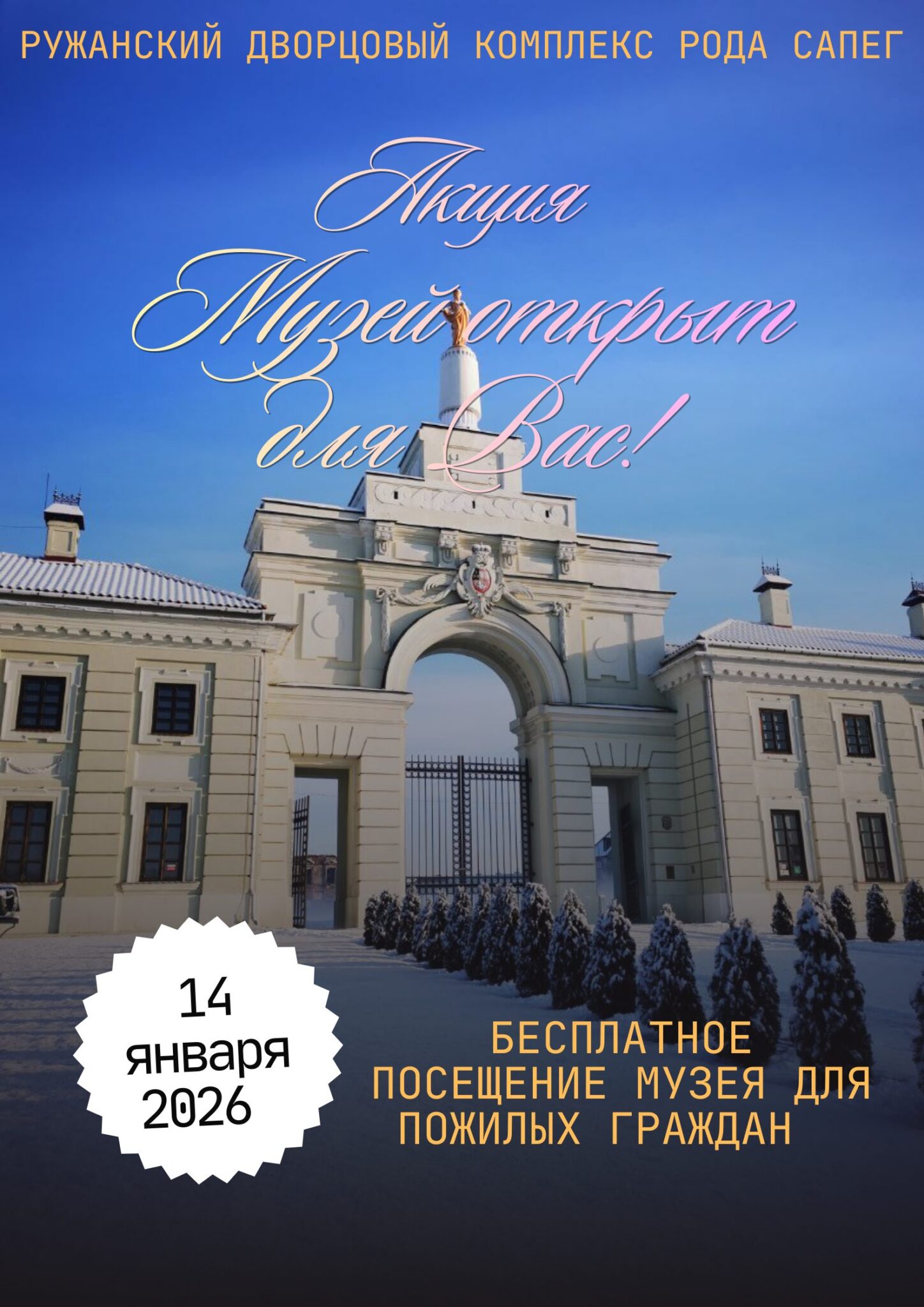 14 января 2026 года в государственном учреждении культуры «Ружанский дворцовый комплекс рода Сапег» будет проходить акция «Музей открыт для вас!», в рамках которой лица пожилого возраста смогут посетить музейные экспозиции бесплатно (при наличии подтверждающего документа).